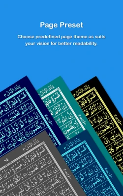 Page preset gives you a totally changed look of Quran pages with beautiful combination of colored background and text. You can choose any preset among given five presets from settings.