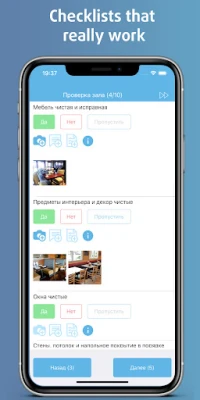 The checklists that work. Employees pass check lists in the mobile application, confirm the fact of execution by photos, write comments, start tasks for correction. All data is stored in the cloud.
