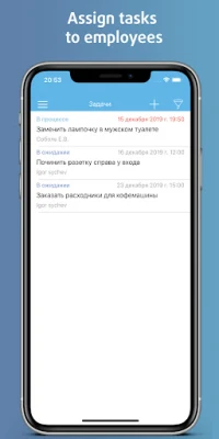 Tasks. To ensure that no problem eludes the solution, set up repair tasks from the mobile app and assign it to the employee. The employee will know about the task by PUSH notification.
